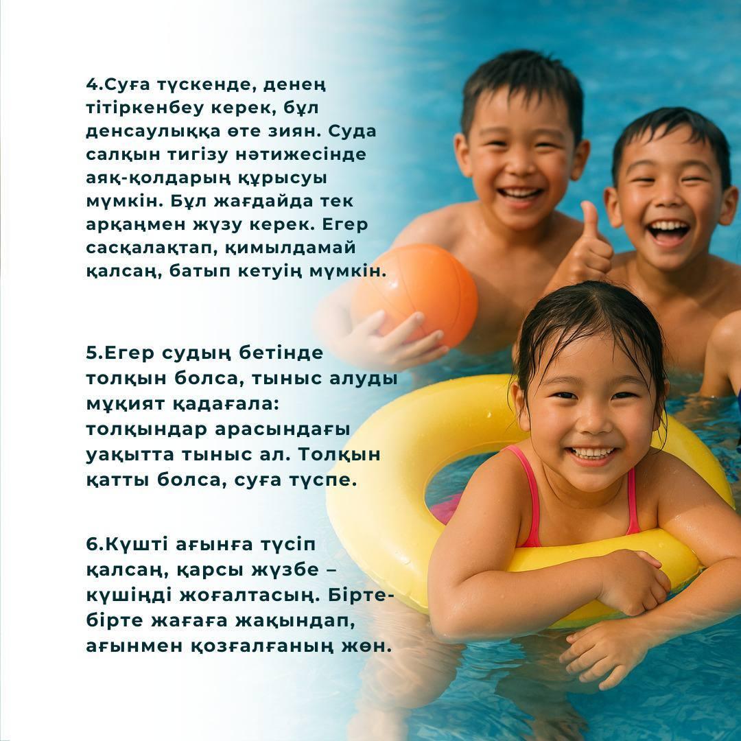 Жазғы демалыс кезінде балалардың қауіпсіздік шараларын сақтауы аса маңызды. Ата-аналарды, балаларды суға түсу ережелерімен танысуға және ол шарттарды сақтауға шақырамыз.