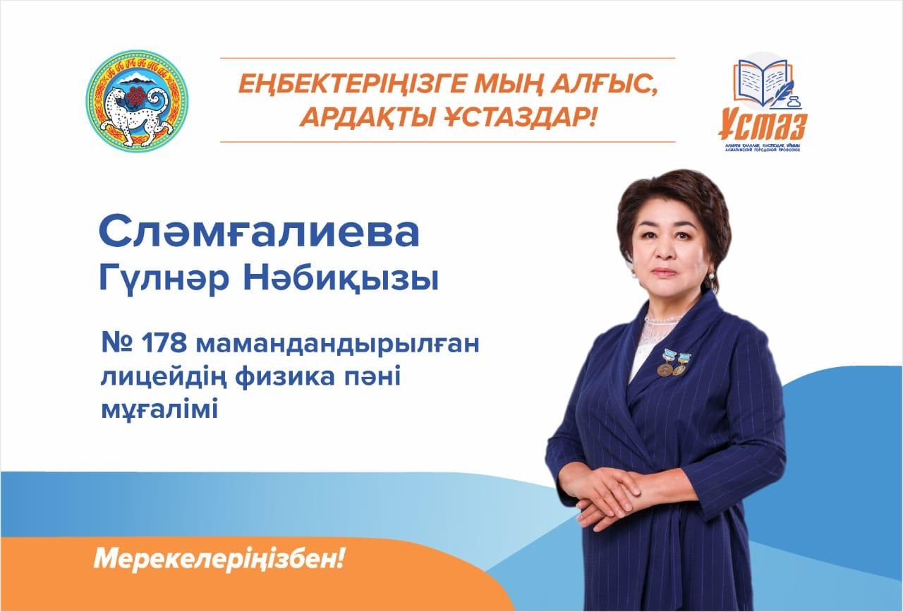 "ҮЗДІК ПЕДАГОГ" атағының иегерлері, шебер ұстаздар — физика пәнінің мұғалімі Слямгалиева Гульнар Набиевна мен математика пәні мұғалімі Амалбекова Лунара Еркиновна ұстаздық шеберліктерімен республиканың мақтаныштарына айналды! Қаланың төріне суреттері ілініп, көптің ықыласына бөленді! Қос ұстаз, Сіздердің ғылымға деген сүйіспеншіліктеріңіз бен шәкірттерге арнаған еңбектеріңіз – ұрпақ болашағына қосқан өлшеусіз үлес.