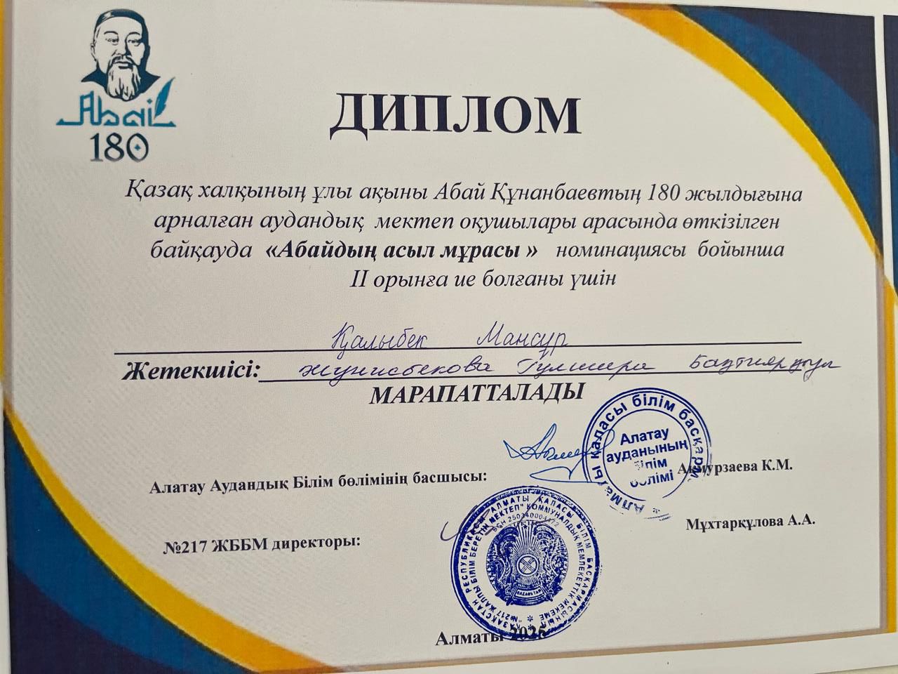 Аталған байқауда Қалыбек Мансұр «Абайдың асыл мұрасы» номинациясы бойынша II орын иеленді.
