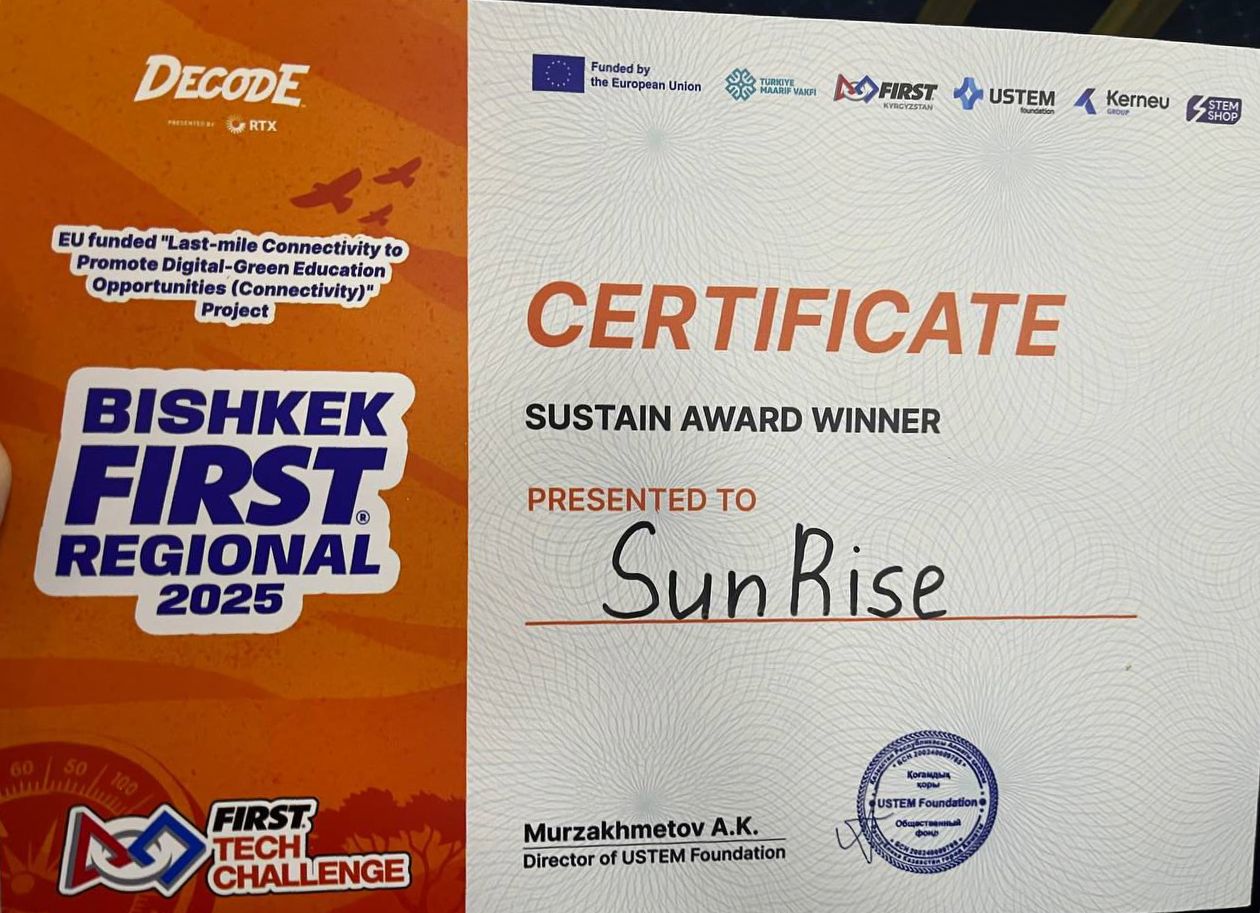 Бішкекте өткен халықаралық Bishkek FIRST regional 2025 робототехника сайысында №178 мамандандырылған лицейдің "SunRise" командасы жоғары нәтиже көрсетіп, Central Asia кезеңіне жолдаманы жеңіп алды. Сонымен қатар, команда "Sustain Award Winner" номинациясын иеленәп, өз шеберлігі мен тұрақты дамуға қосқан үлесін дәлелдеді.