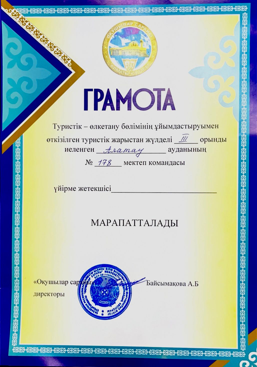 Алматы қаласы Білім басқармасы Оқушылар сарайының «Туристік–өлкетану» бөлімінің ұйымдастыруымен өткен 5–8 сынып оқушылары арасындағы қалалық туристік жарысқа қатысып, III орын иеленгені үшін 5 «Ә» сынып оқушыларынан құралған команда грамотамен марапатталды.