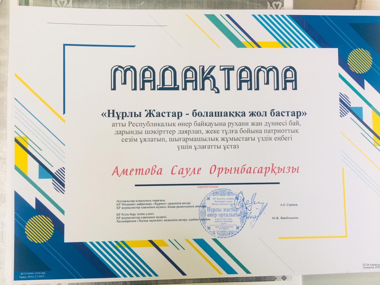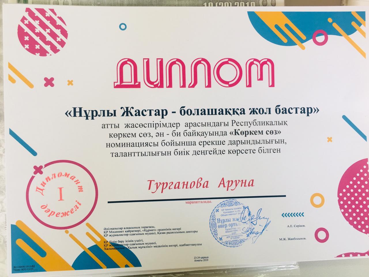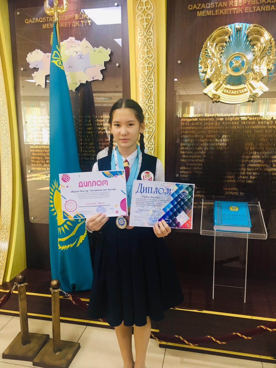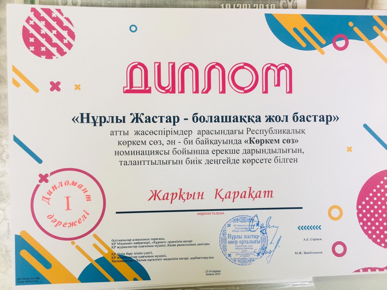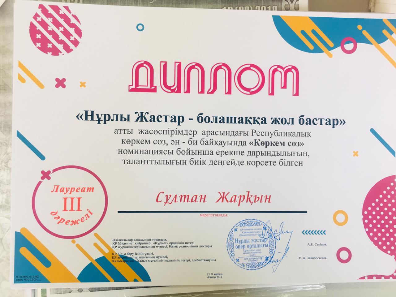 7"Ж" сыныбының оқушылары Турганова Аруна, Ауез Жасмин және Жархын Қарақат - 1 дәрежелі дипломдарға ие болса, 7"Б" сынып оқушысы Сұлтан Жарқын - 3 дәрежелі дипломның лауреаты және арнайы кубокты еншіледі. Жетекшілері қазақ тілі мен әдебиеті пәнінің мұғалімі Аметова Сәуле Орынбасарқызы шығармашылық еңбегі үшін Алғыс хатымен марапатталды.