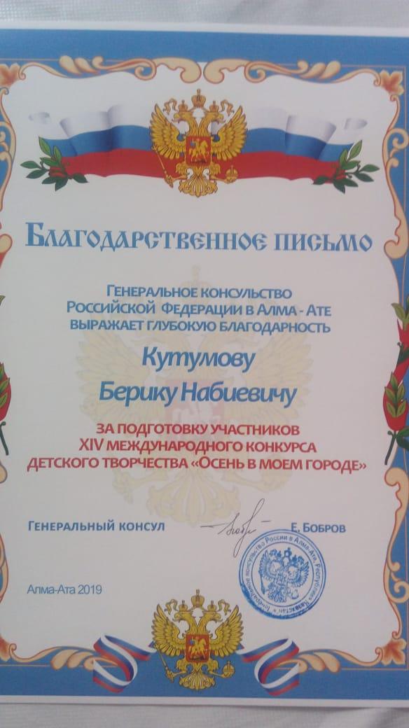 Мұғалімдерімізге алғыс хат «Осень в моем городе» тақырыбында өткен ХІV халықаралық конкурсына оқушыларды дайындағаны үшін берілді.