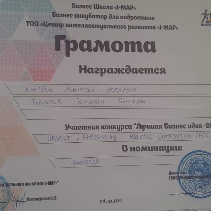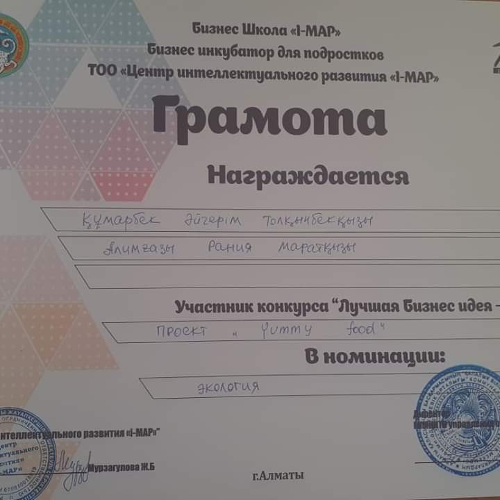 Алматы қаласы білім беру ұйымдарының оқушылары арасында өткізілген «Ең үздік Бизнес идея-2019» байқауының жеңімпазы Бақыт Марат «Globus» жобасынан ІІ орын жеңіп алды. Сонымен қатар байқауға қатысқаны үшін Кәкібай Асанбай, Талғатов Темірлан, Сатыбалды Нұрболат, Байғалиев Әсет, Құмарбек Әйгерім, Алимғазы Рания және жоба кураторы Кутумов Берік арнайы мадақтамалармен марапатталды.