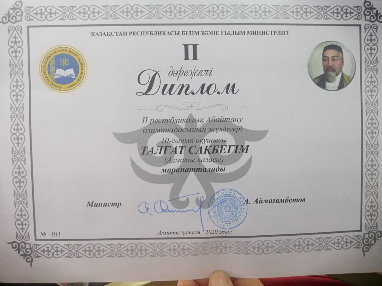 Алатау ауданына қарасты №178 лицейдің 10 сынып оқушысы Талғат Сақбегім ІІ Республикалық Абайтану олимпиадасына қатысып, ІІ дәрежелі дипломмен марапатталды. Оқушымыздың жеңісімен құттықтаймыз!