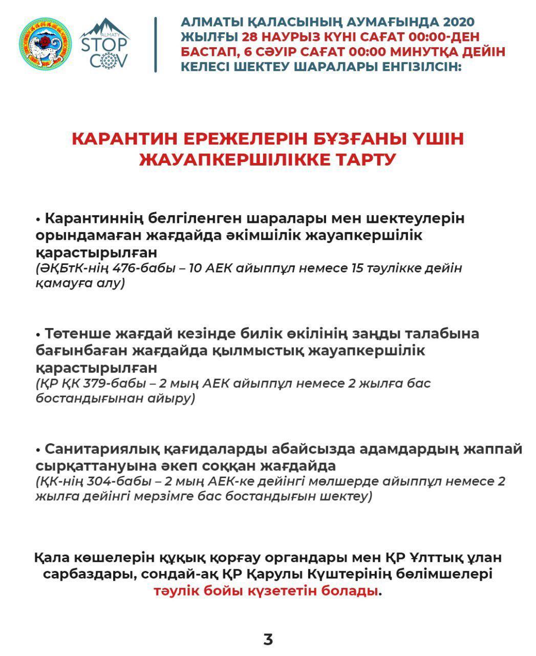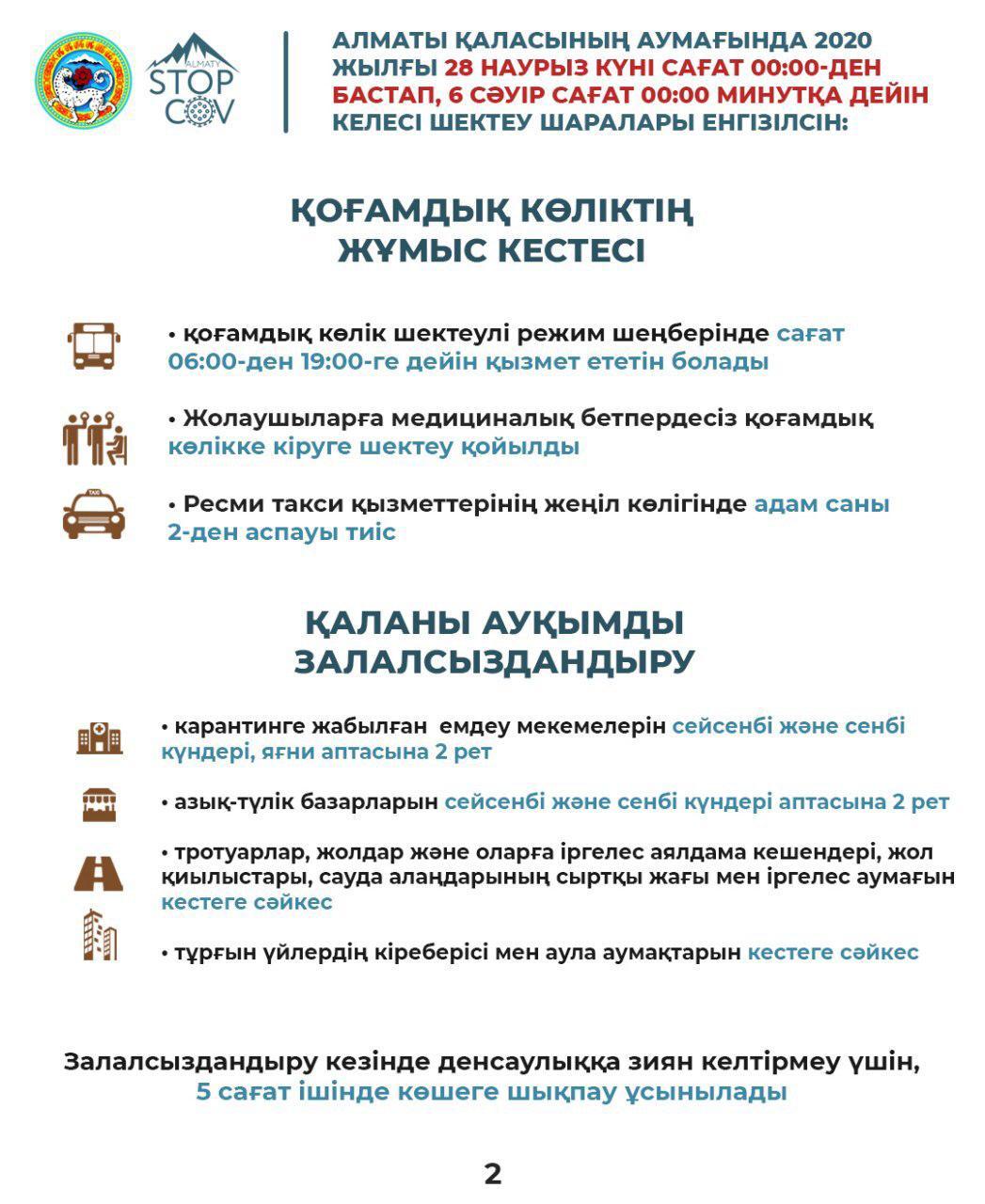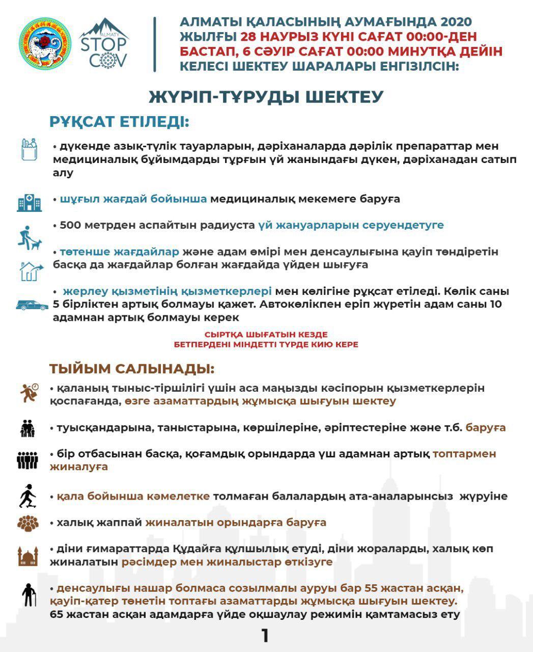 28 март 2020 0 1 2 3 4 5 Алматы қаласының аумағында шектеу шаралары енгізіледі Алматы қаласының аумағында 2020 жылғы 28 наурыз күні сағат 00:00 -ден бастап, 6 сәуір сағат 00:00 минутқа дейін келесідей шектеу шаралары енгізіледі: Осы беттің QR-коды:QR-код этой страницы: