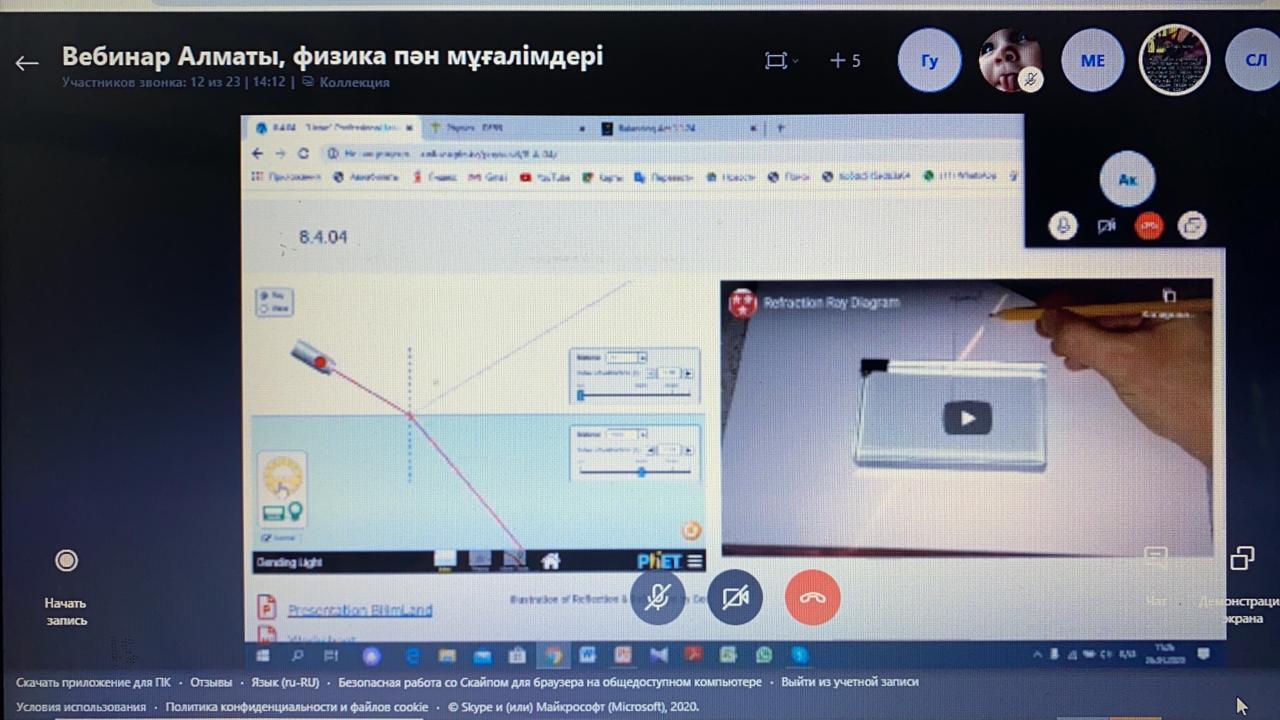 26.04.2020ж. күні сағат 11.00-де "Қашықтықтан оқыту жағдайында зертханалық жұмысты жүзеге асыруда Phet colorado бағдарламасын қолдану" тақырыбында скайпта Алматы қаласының физика пән мұғалімдері үшін вебинар болды. Вебинарда бірлескен жұмыс нәтижесі көрсетілді. №178 лицейдің физика пәнінің мұғалімі Жұмағұлова Сағила өз тəжірибесімен Алматы қаласы мұғалімдерімен бөлісті.
