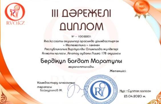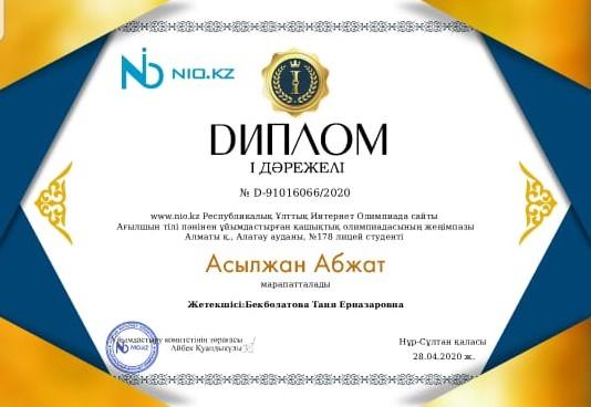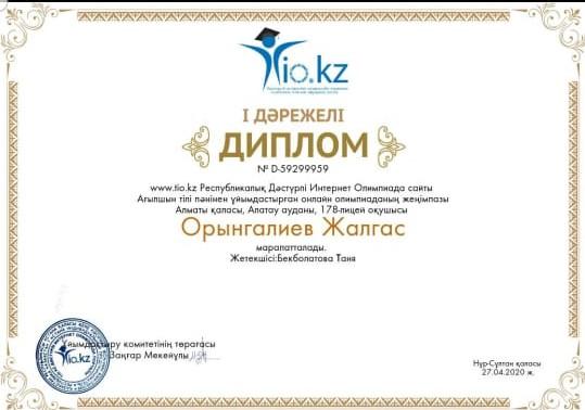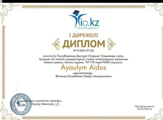 Қашықтықтан Республикалық Дәстүрлі Интернет және Ұлттық Интернет Олимпиада сайттары ұйымдастырған ағылшын, математика, география пәндері бойынша өткізілген олимпиадаға лицейіміздің оқушылары мен мұғалімдері қатысып, І дәрежелі дипломдарымен марапатталды. Оқушыларымыз бен мұғалімдерімізді айтулы жеңістерімен құттықтаймыз!