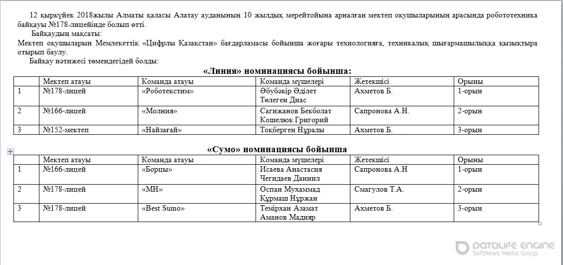 12 қыркүйек 2018жылы Алматы қаласы Алатау ауданының 10 жылдық мерейтойына арналған мектеп оқушыларының арасында робототехника байқауы №178-лицейінде болып өтті.