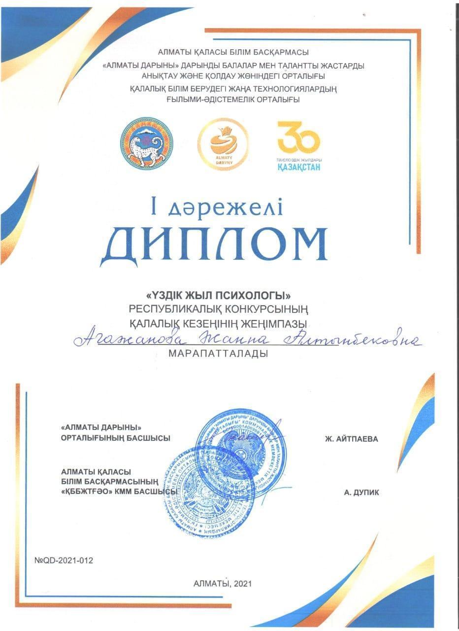 Жоғары деңгейдегі кәсіби құзіреттілікті көрсете білетін дарынды, шығармашыл психолог қызметкерлерді анықтау және психология ғылымының мәртебесін көтеру мақсатында ұйымдастырылған «Үздік жыл психологы» конкурсының қалалық кезеңіне қатысқан №178 мамандандырылған лицейдің психологы Агажанова Жанна Алтынбековна жеңімпаз атанып,"Үздік жыл психологы" байқауының