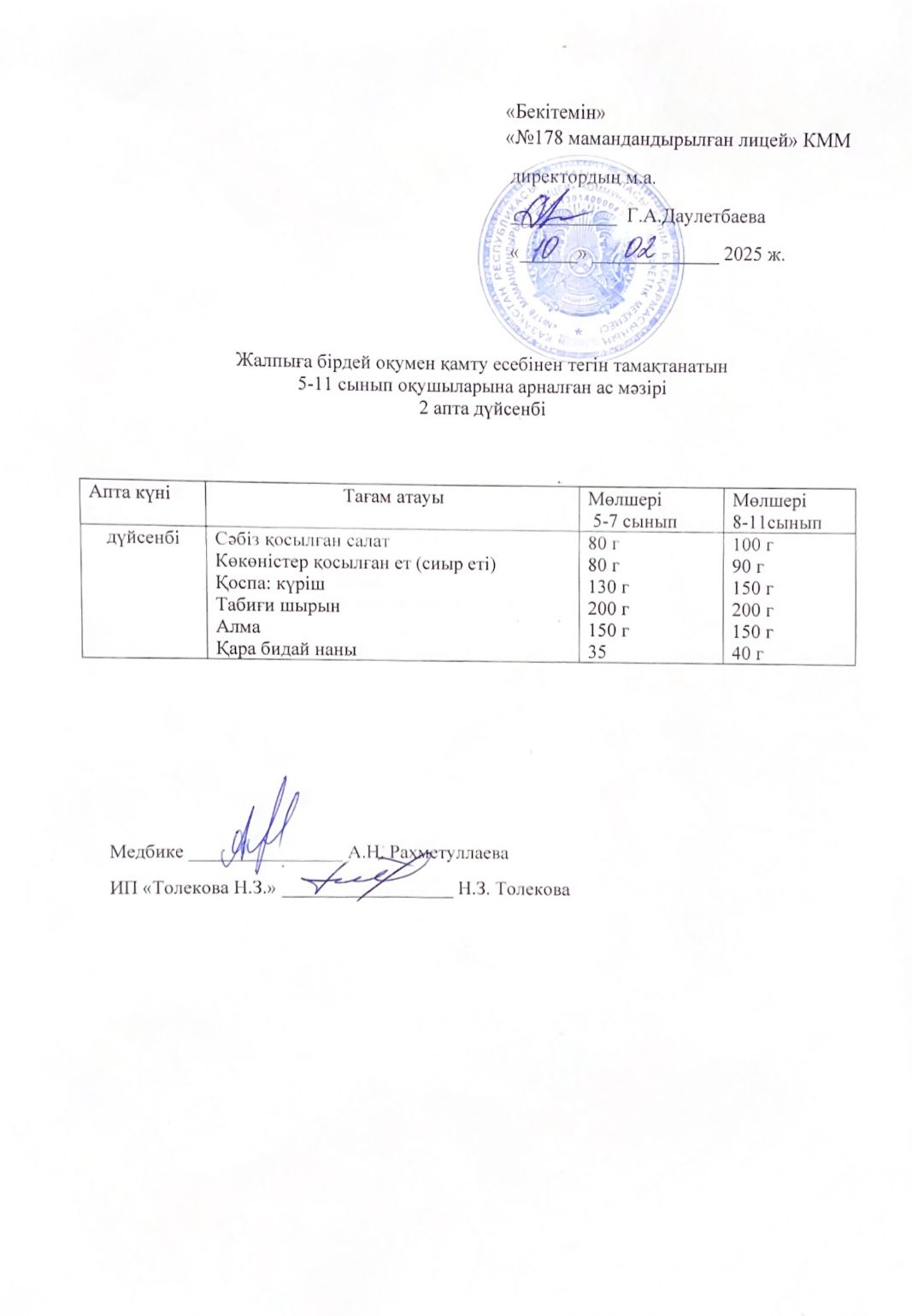 Ас мәзірі - 10.02.2025 жыл