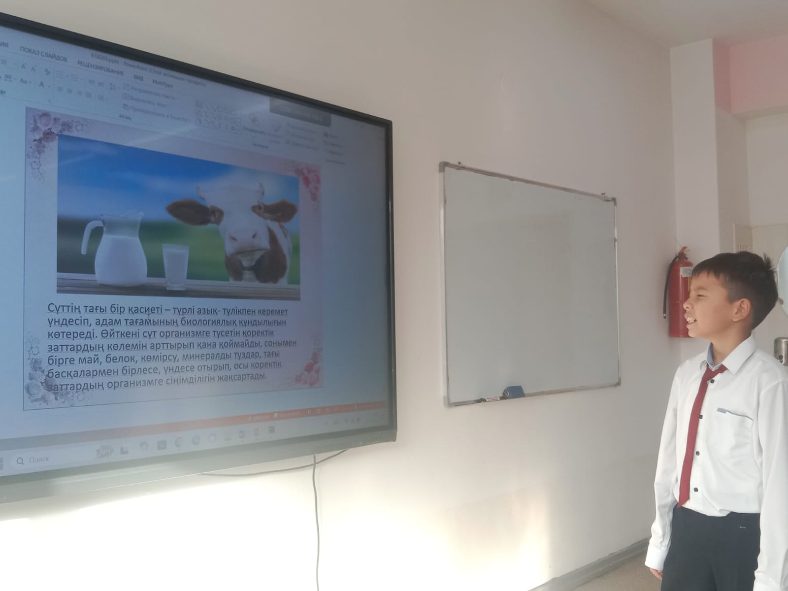 "Дұрыс тамақтануды" насихаттау мақсатында 5/7 сыныптар арасында "Сүт тағамдарының – адам ағзасына пайдасы" тақырыбында тәрбие сағаты өтті. Сүт тағамдары – адам ағзасы үшін маңызды көптеген қоректік заттардың табиғи көзі. Олардың пайдасы төмендегідей:1. Кальций және сүйек денсаулығы. Сүт, айран, сүзбе, ірімшік – кальцийге ең бай өнімдер.
