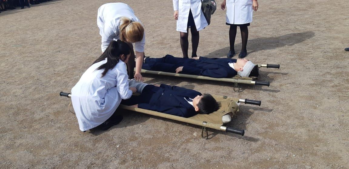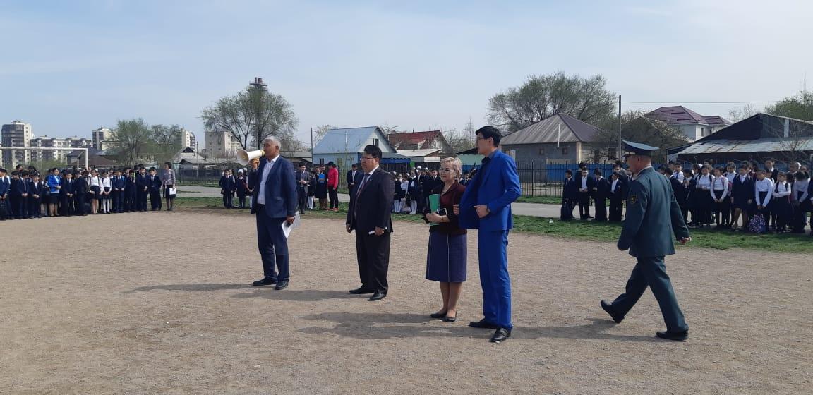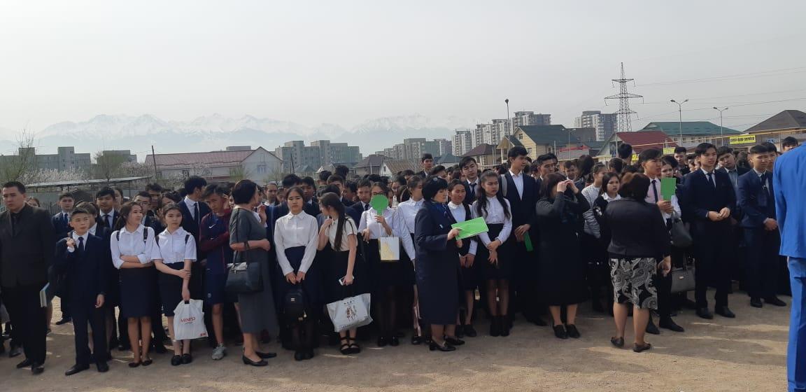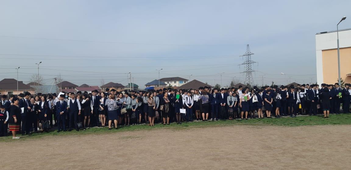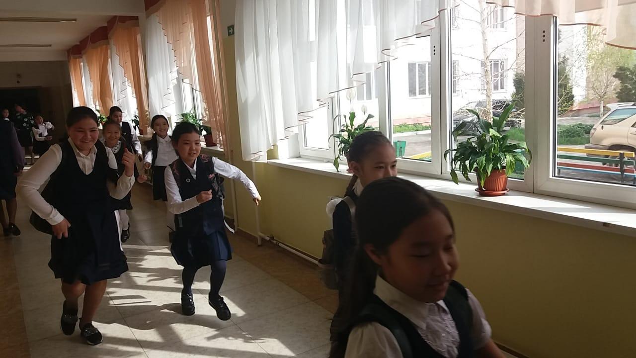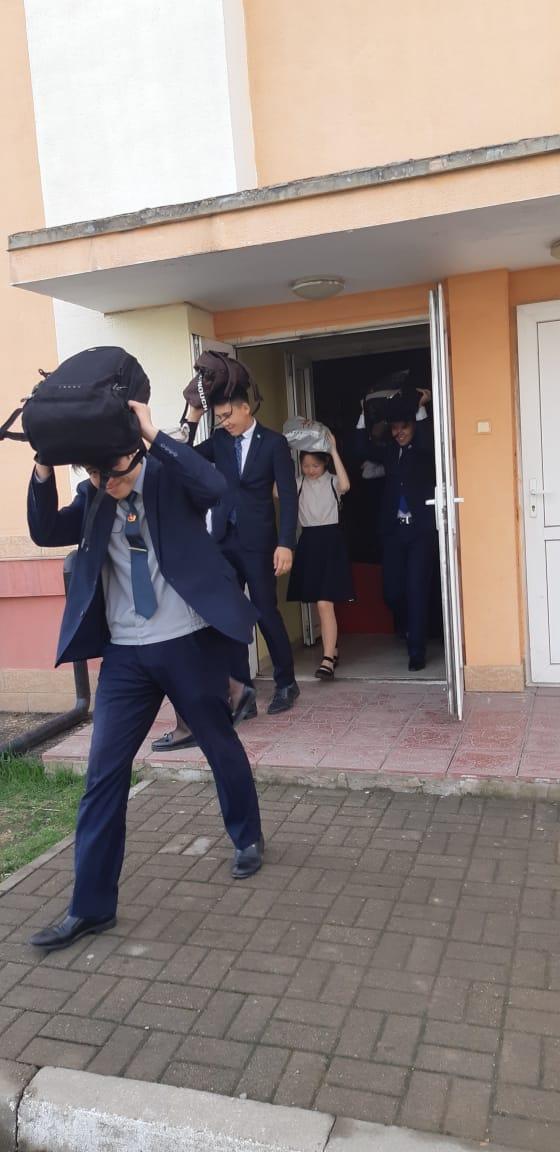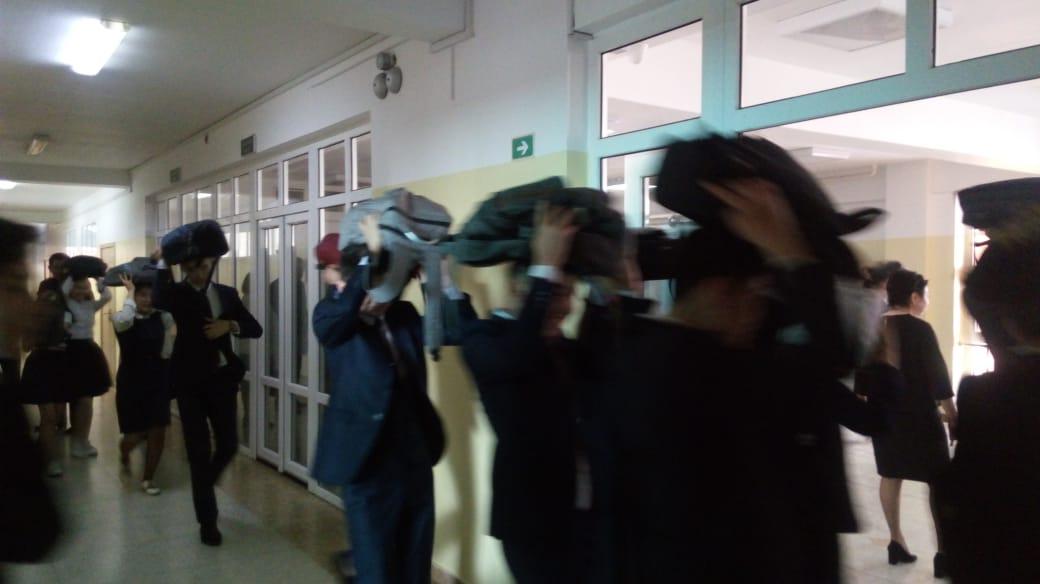 Дыбыстық белгі берілген бетте, барлығы ғимараттан шығып үлгерді. Аулаға шыққан оқушыларды сынып ұстаздары қолдарындағы түрлі-түсті белгімен түгендеді.